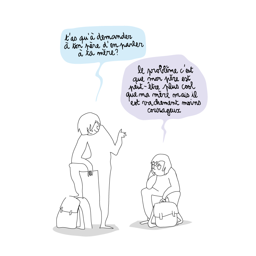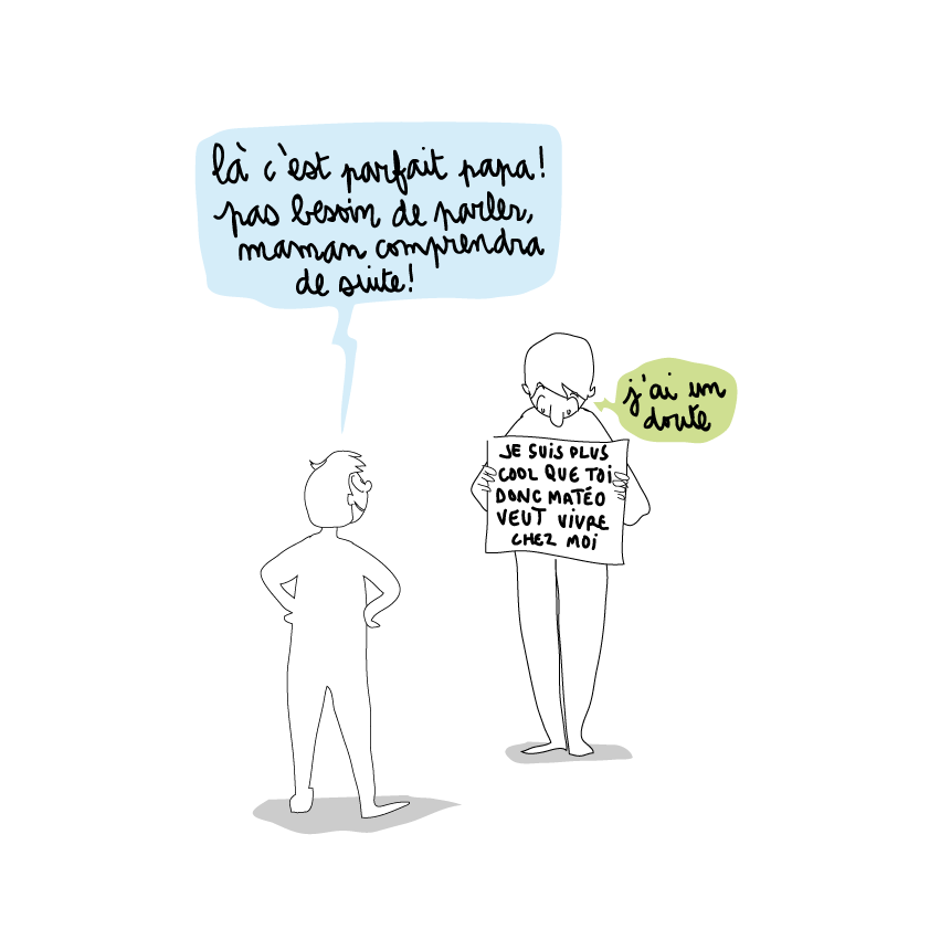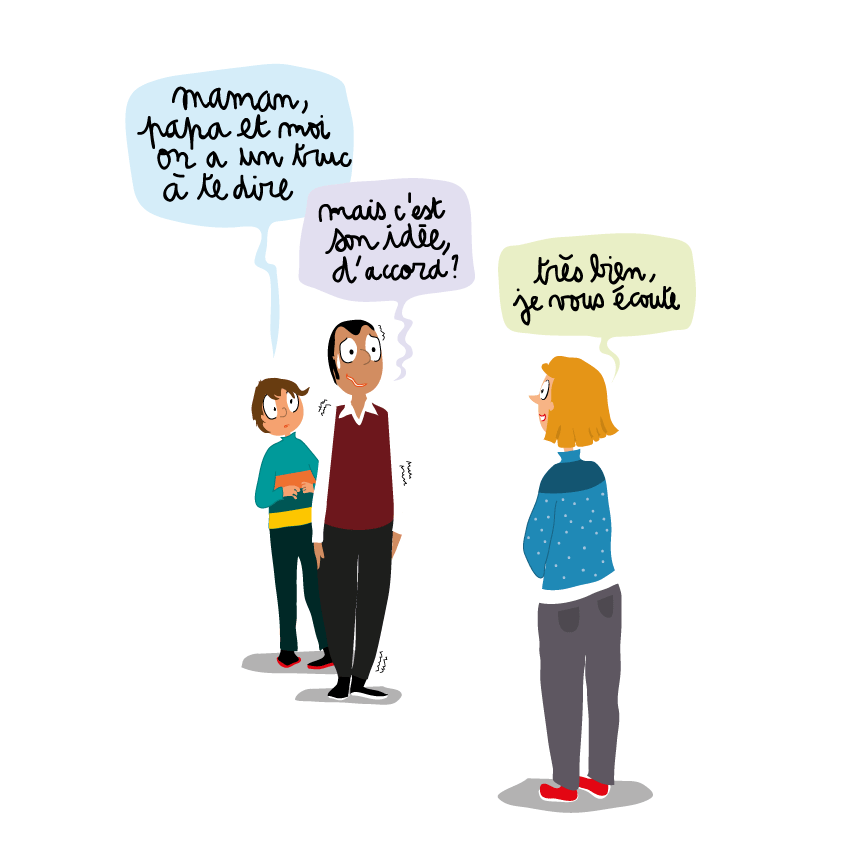 Le sujet à illustrer était le suivant : « Comment dire à ma mère que je veux aller vivre chez mon père quand j’irai au lycée, pour changer d’air ? Elle est plus stricte que lui.«